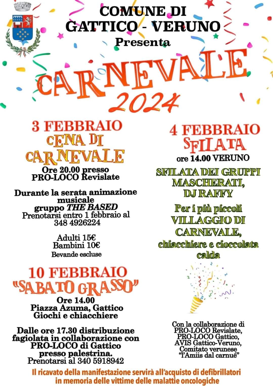 Il Comune di Gattico-Veruno, in collaborazione con Pro Loco Veruno Revislate, Pro Loco Gattico, Avis Gattico-Veruno e Comitato "l'Amiis dal Carnuè", presenta il Carnevale 2024