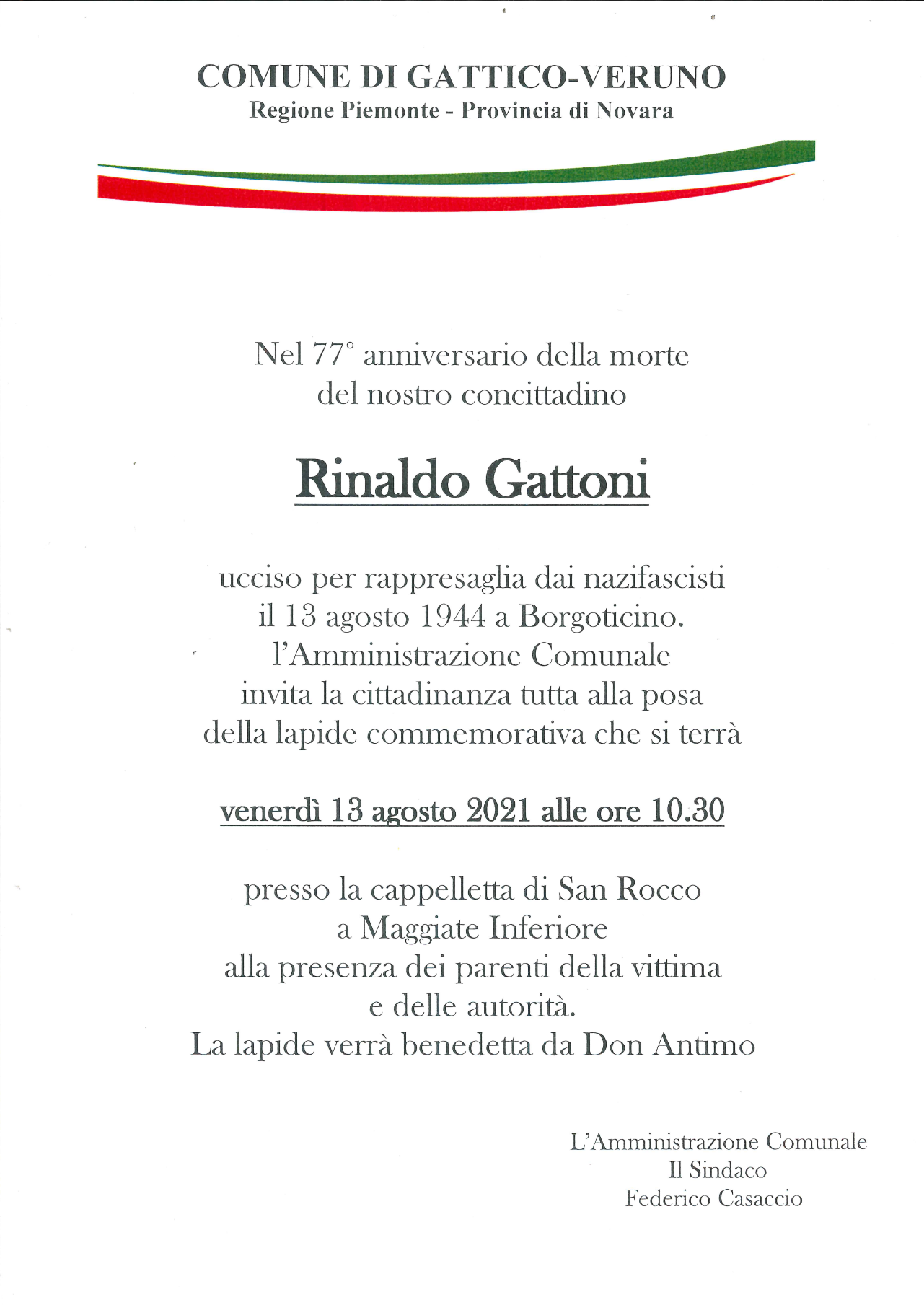L'Amministrazione Comunale invita la cittadinanza alla scopertura della targa commemorativa in memoria del concittadino Rinaldo Gattoni, ucciso durante la rappresaglia nazifascista avvenuta a Borgo Ticino il 13 agosto 1944.