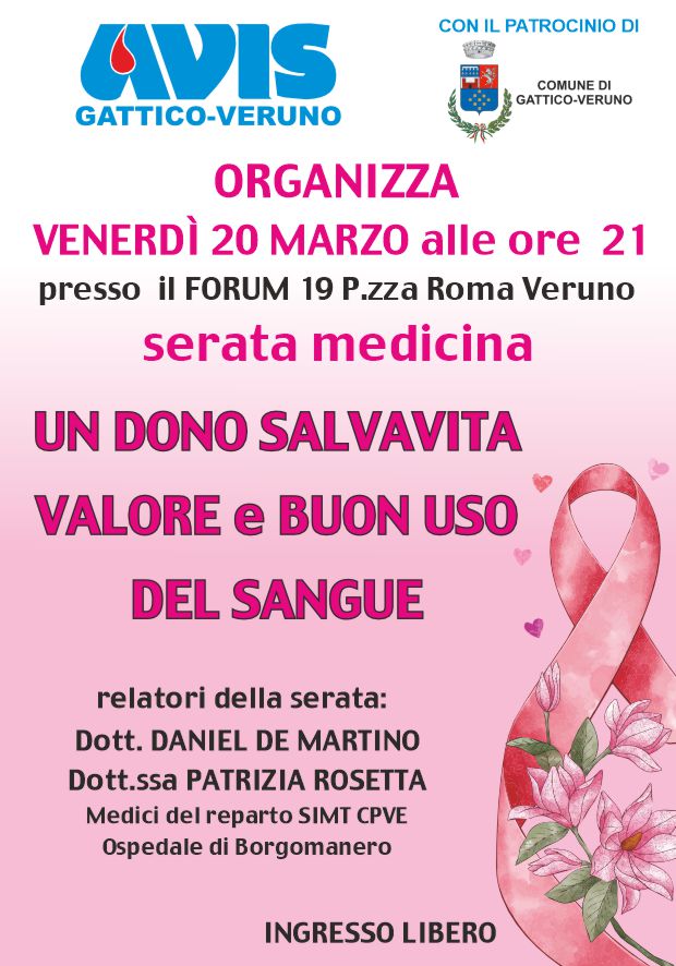 La serata è organizzata dall'AVIS comunale Gattico-Veruno e avrà come relatori il dott. Daniel De Martino e la dott.ssa Patrizia Rosetta, medici del reparto SIMT CPVE dell'ospedale di Borgomanero.